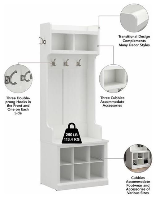 - Family-Friendly: A hall tree with a bench, cubbies for shoes and backpacks, and a mirror at kid-friendly height. Add a chalkboard to keep track of schedules and notes.