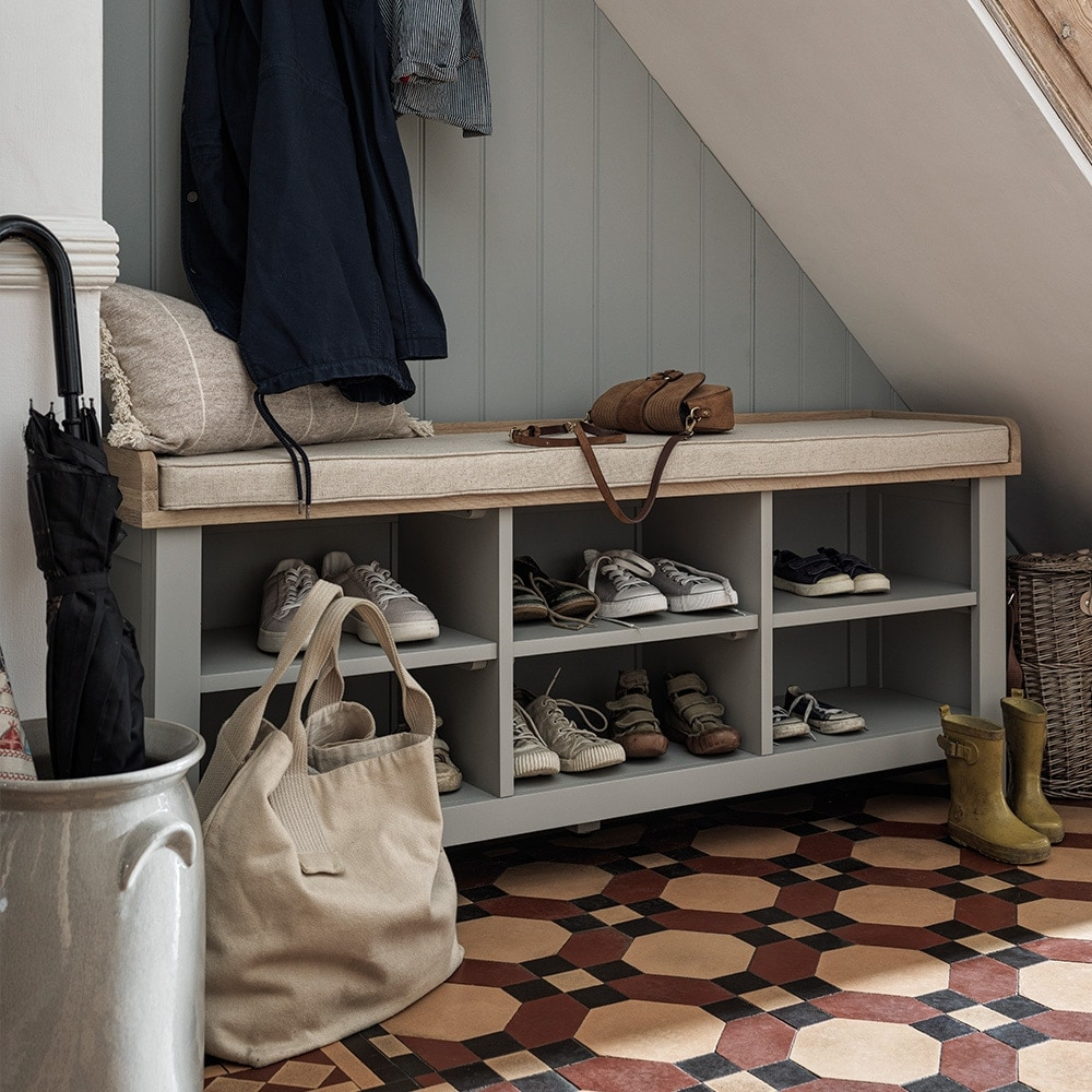 - Bench with Cubbies and Drawers: Picture a comfortable seating bench with individual cubbies underneath, perfect for assigning to family members for their shoes or bags. Add a couple of integrated drawers below for smaller items. This offers both seating and varied storage options.