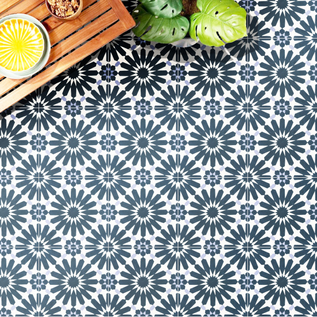 - Moroccan-Inspired Motifs: Many cement tiles feature designs inspired by traditional Moroccan zellige or zellij. These often involve intricate floral or arabesque elements that create a rich, exotic feel. The navy and white combination lends a fresh, modern interpretation to these classic designs.